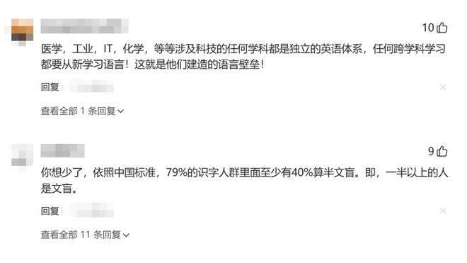 “医学,工业,IT,化学,等等涉及科技的任何学科都是独立的英语体系,任何跨学科学习都要从新学习语言!这就是他们建造的语言壁垒!”,一位网友评论道。