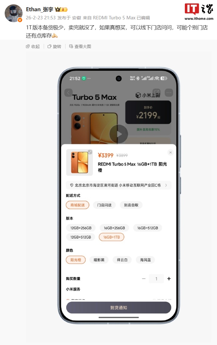 IT之家注意到,小米 REDMI 手机市场经理张宇昨晚发文称:“1T 版本备货极少,卖完就没了,如果真想买,可以线下门店问问,可能个别门店还有点库存。”